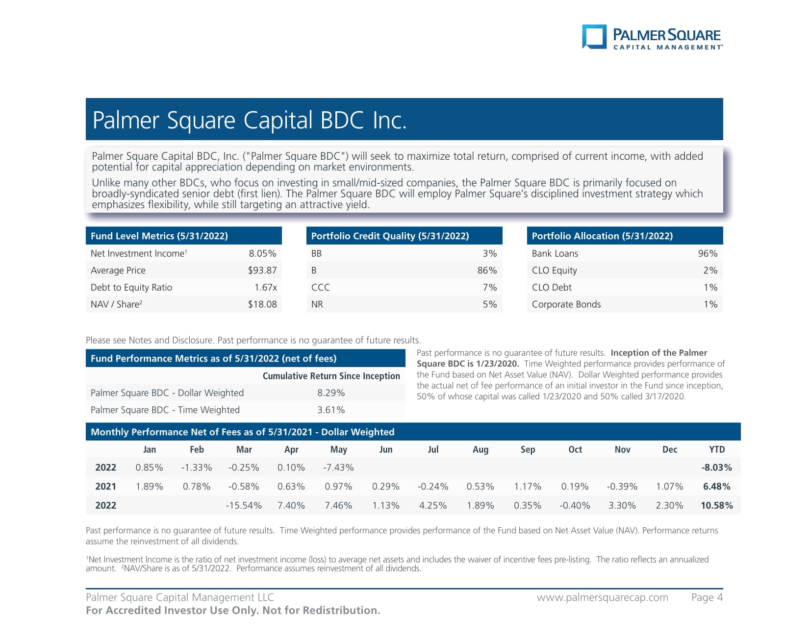 Past performance is no guarantee of future results. Time Weighted performance provides performance of the Fund based on Net Asset Value (NAV). Performance returns assume the reinvestment of all dividends. 1 Net Investment Income is the ratio of net investment income (loss) to average net assets and includes the waiver of incentive fees pre - listing. The ratio reflects an annualized amount. 2 NAV/Share is as of 5/31/2022. Performance assumes reinvestment of all dividends. P a l m e r S q u a r e C ap i t a l M a n a g e m e n t L L C ww w .p a l m e r s q u a r ec a p . c o m P a g e 4 For Accredited Investor Use Only. Not for Redistribution. i P a l m e r S q u a r e C a p i t a l B D C I n c . Palmer Square Capital BDC, Inc . ("Palmer potential for capital appreciation depend U nli k e m a n y o the r B D C s , w h o f o c u s o n i broadly - syndicated senior debt (first lien) . emphasizes flexibility, while still targeting S q u a ng o n v e s t i The a n a re BDC") will seek to maximize total return n market environments . ng in small/mid - sized companies, the Palm P a l m e r S q u a r e B DC w il l emp l o y P a l m e r Sq ttractive yield . , c o m e r Sq u a re ’ s prised of current income, with added u a r e B DC i s pr im ar i ly f o c u sed o n disciplined investment strategy which Fund Level Metrics (5/31/2022) Portfolio Credit Quality (5/31/2022) Portfolio Allocation (5/31/2022) Net Investment Income 1 8.05% BB 3% Bank Loans 96% A verage Price $93.87 B 86% CLO Equity 2% Debt to Equity Ratio 1.67x CCC 7% CLO Debt 1% N A V / Sha r e 2 $18.08 Please see Notes and Disclosure. Past performance is no guarantee of future results. Fund Performance Metrics as of 5/31/2022 (net of fees) Past performance is no guarantee of future results. Inception of the Palmer Square BDC is 1/23/2020. Time Weighted performance provides performance of Cumulative Return Since Inception the Fund based on Net Asset Value (NAV). Dollar Weighted performance provides Palmer Squa r e BDC - Dollar W eighted 8.29% th e actual 50 % o f who ne t o f fe e per s e capital formanc e of wa s calle d 1/2 a n initia l inve 3/202 0 and sto r i n the 50 % called Fun d sinc e inc 3/17/2020. eption, Palmer Squa r e BDC - T ime W eighted 3.61% Monthly Performance Net of Fees as of 5/31/2021 - Dollar Weighted Jan Feb Mar Apr May Jun Jul Aug Sep Oct Nov Dec YTD 2022 0.85% - 1.33% - 0.25% 0.10% - 7.43% - 8.03% 2021 1.89% 0.78% - 0.58% 0.63% 0.97% 0.29% - 0.24% 0.53% 1.17% 0.19% - 0.39% 1.07% 6.48% 2022 - 15.54% 7.40% 7.46% 1.13% 4.25% 1.89% 0.35% - 0.40% 3.30% 2.30% 10.58%