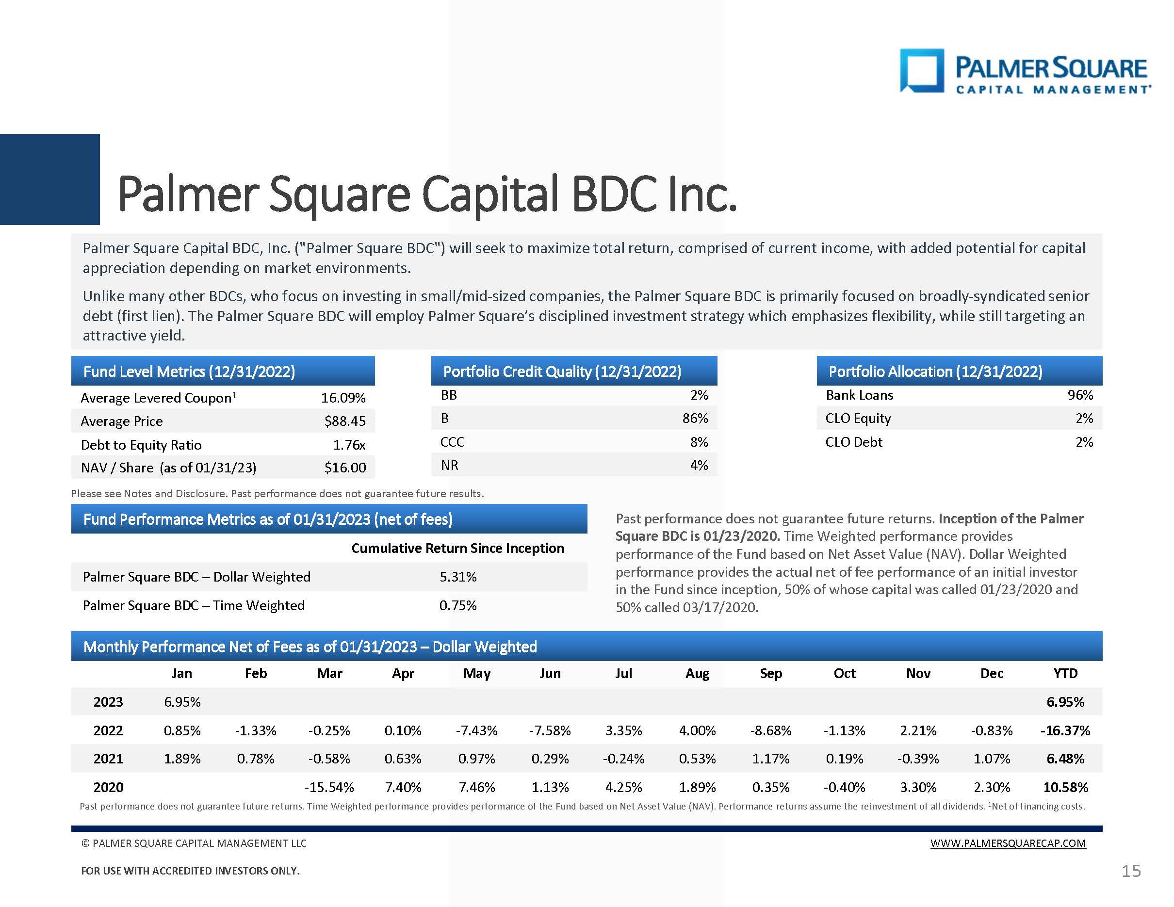 Palmer Square Capital BDC Inc. Fund Level Metrics (12/31/2022) Portfolio Credit Quality (12/31/2022) Monthly Performance Net of Fees as of 01/31/2023 '–' Dollar Weighted Average Levered Coupon1 16.09% Average Price $88.45 Debt to Equity Ratio 1.76x NAV / Share (as of 01/31/23) $16.00 BB 2% B 86% CCC 8% NR 4% Past performance does not guarantee future returns. Time Weighted performance provides performance of the Fund based on Net Asset Value (NAV). Performance returns assume the reinvestment of all dividends. 1Net of financing costs. Past performance does not guarantee future returns. Inception of the Palmer Square BDC is 01/23/2020. Time Weighted performance provides performance of the Fund based on Net Asset Value (NAV). Dollar Weighted performance provides the actual net of fee performance of an initial investor in the Fund since inception, 50% of whose capital was called 01/23/2020 and 50% called 03/17/2020. Palmer Square Capital BDC, Inc. ("Palmer Square BDC") will seek to maximize total return, comprised of current income, with added potential for capital appreciation depending on market environments. Unlike many other BDCs, who focus on investing in small/mid-sized companies, the Palmer Square BDC is primarily focused on broadly-syndicated senior debt (first lien). The Palmer Square BDC will employ Palmer Square'’'s disciplined investment strategy which emphasizes flexibility, while still targeting an attractive yield. 15 Portfolio Allocation (12/31/2022) Bank Loans 96% CLO Equity 2% CLO Debt 2% Fund Performance Metrics as of 01/31/2023 (net of fees) Cumulative Return Since Inception Palmer Square BDC '–' Dollar Weighted 5.31% Palmer Square BDC '–' Time Weighted 0.75% Please see Notes and Disclosure. Past performance does not guarantee future results. Jan Feb Mar Apr May Jun Jul Aug Sep Oct Nov Dec YTD 2023 6.95% 6.95% 2022 0.85% -1.33% -0.25% 0.10% -7.43% -7.58% 3.35% 4.00% -8.68% -1.13% 2.21% -0.83% -16.37% 2021 1.89% 0.78% -0.58% 0.63% 0.97% 0.29% -0.24% 0.53% 1.17% 0.19% -0.39% 1.07% 6.48% 2020 -15.54% 7.40% 7.46% 1.13% 4.25% 1.89% 0.35% -0.40% 3.30% 2.30% 10.58% '©' PALMER SQUARE CAPITAL MANAGEMENT LLC WWW.PALMERSQUARECAP.COM FOR USE WITH ACCREDITED INVESTORS ONLY.
